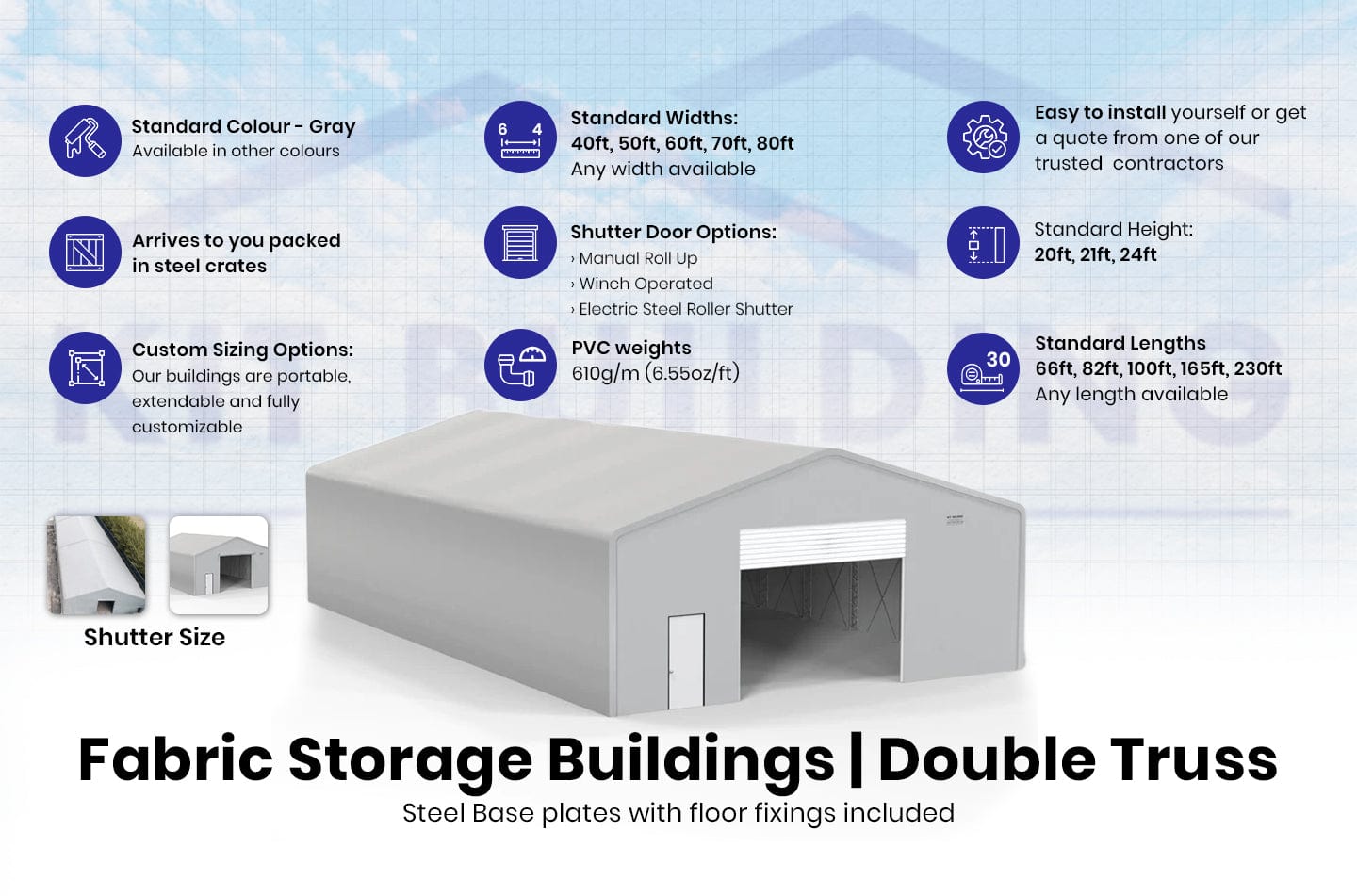 En Kit Buildings, utilizamos solo materiales de alta calidad para garantizar que nuestras estructuras sean duraderas, funcionales y construidas para durar. Todos nuestros edificios están construidos con marcos de acero galvanizado para una resistencia superior y resistencia a la corrosión. Dependiendo del modelo, ofrecemos una variedad de opciones de revestimiento, incluyendo tela de PVC retardante de fuego y resistente a los UV, y chapas de acero con perfil de caja. Para edificios aislados, puede elegir entre aislamiento de EPS, Rockwool o PIR para adaptarse a sus requisitos específicos.