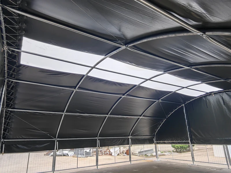 Un edificio agrícola cubierto con PVC es una estructura de marco de acero revestida con tela de PVC de alta resistencia. Estos pabellones agrícolas ofrecen grandes espacios interiores sin columnas, pueden montarse rápidamente y generalmente implican costos iniciales más bajos que los graneros completamente revestidos de acero.