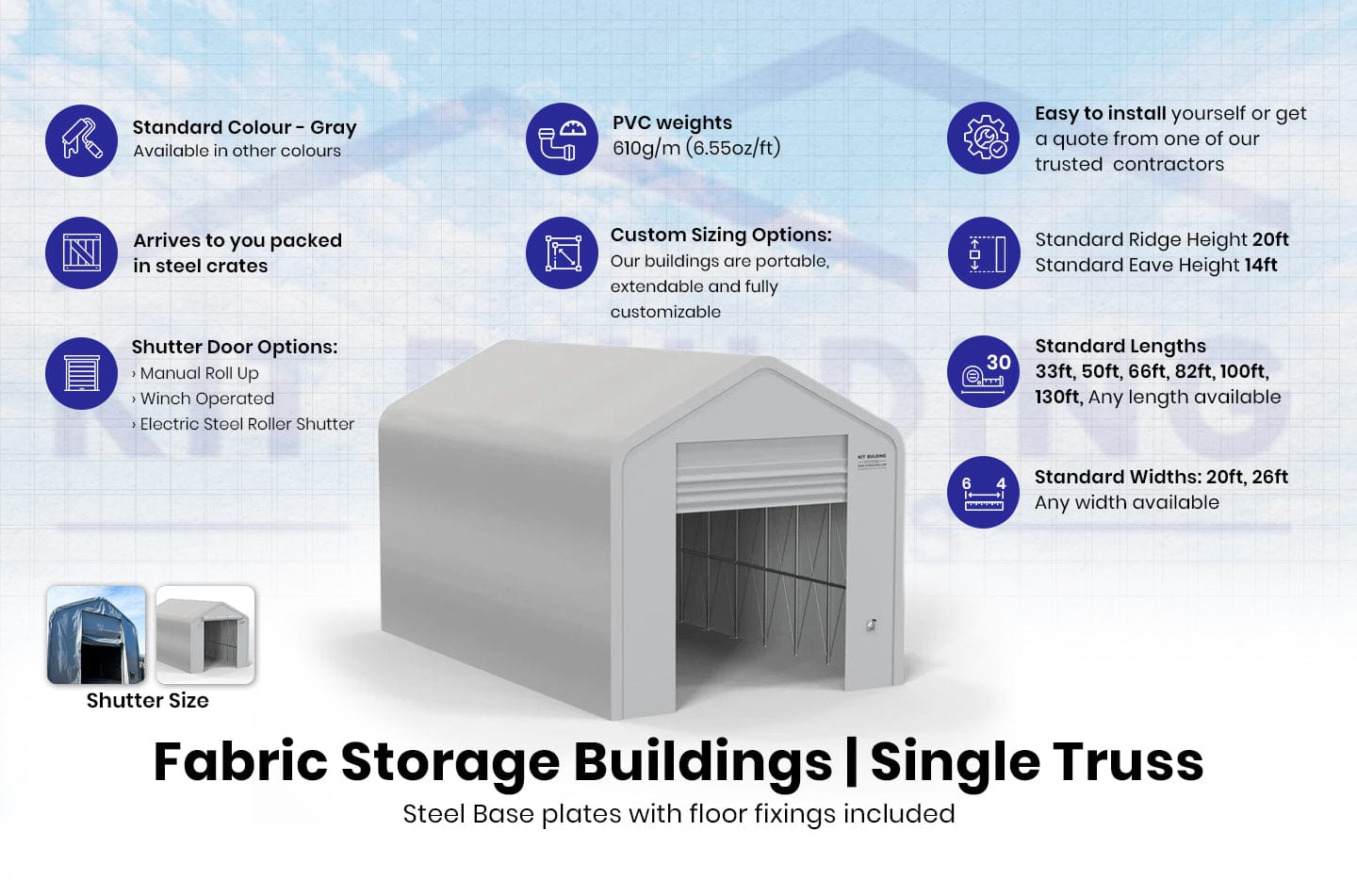 - Materiales de Tela: Ofrecemos una garantía de producto de 5 años en nuestras telas externas de PVC de 23 oz/sy (610g/m²), cubriéndote contra defectos de material. Kit Buildings