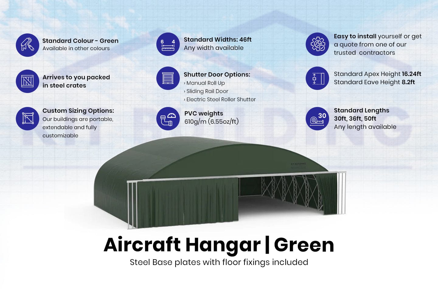 - Materiales de Tela: Ofrecemos una garantía de producto de 5 años en nuestras telas externas de PVC de 23 oz/sy (610g/m²), cubriéndote contra defectos de material. Kit Buildings