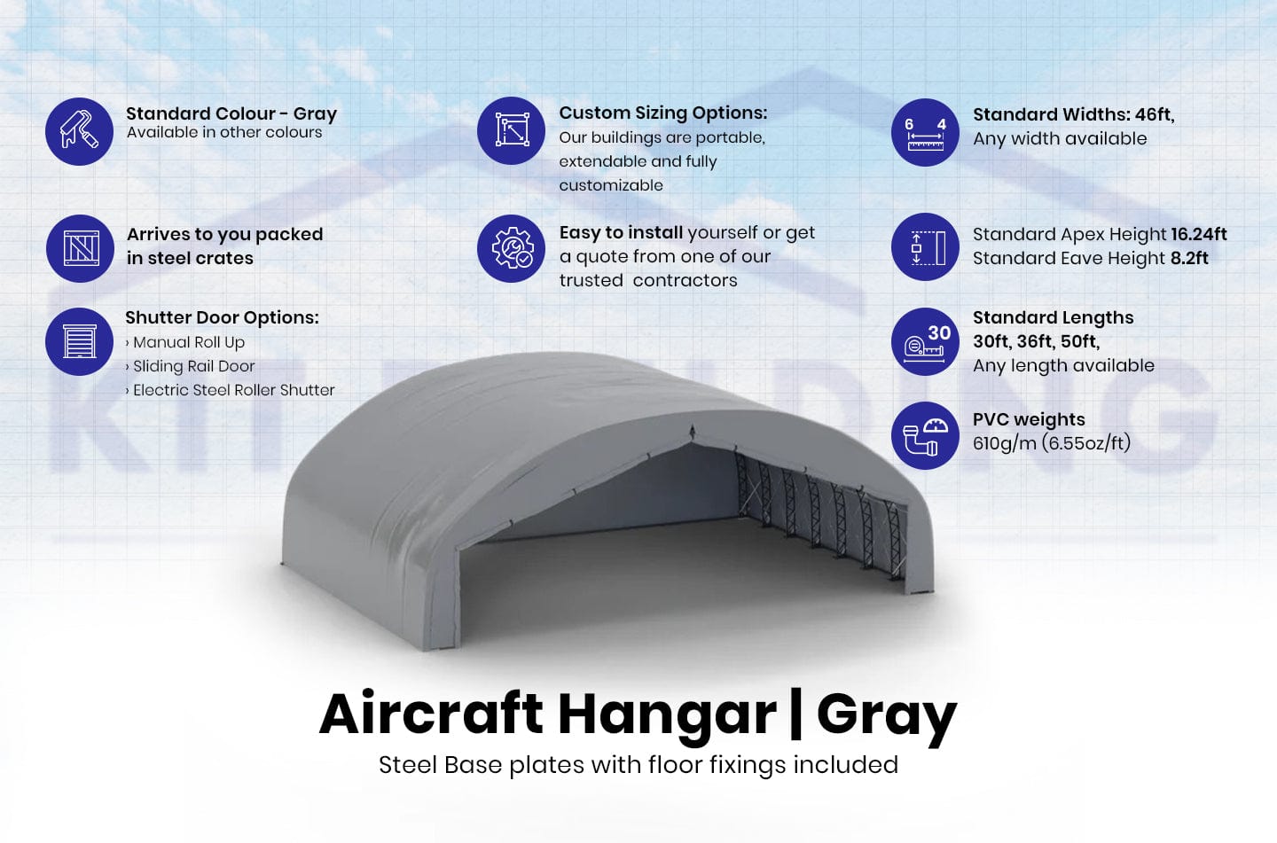 - Materiales de Tela: Ofrecemos una garantía de producto de 5 años en nuestras telas externas de PVC de 23 oz/sy (610g/m²), cubriéndote contra defectos de material. Kit Buildings